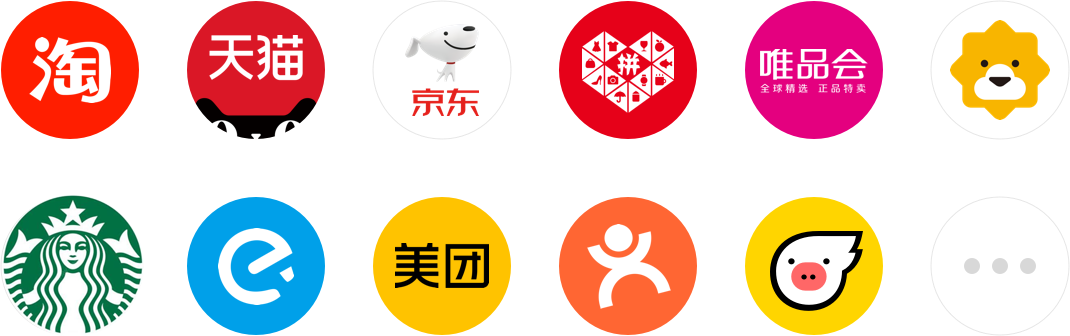 接入淘宝、天猫、京东、拼多多、唯品会、苏宁易购、星巴克、饿了么、美团、
